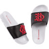 Design Estiloso e Colorido: Slide com cabedal preto e o logo CRF bordado em vermelho, combinando elegância e o orgulho de ser flamenguista.