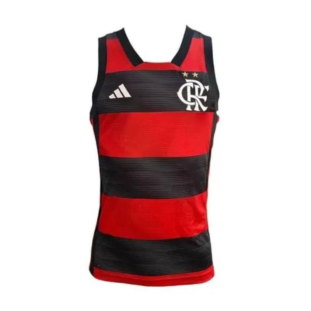 Com uma combinação intensa de vermelho e preto em painéis amplos, a peça traz o escudo do clube em destaque e as icônicas três listras da marca nos ombros. A modelagem solta garante conforto em qualquer movimento — ideal para quem vibra dentro e fora do jogo.